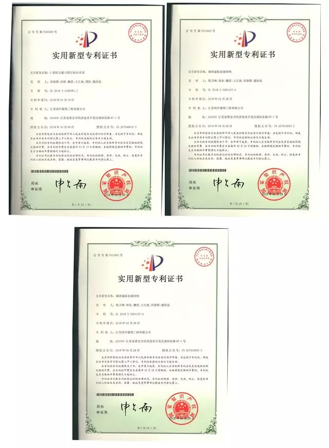 日期:2018-11-27鸿升企业集团自主研发的“U型铝方通与筒灯组合吊顶”等三项专利已获得国家知识产权局正式授权。一直以来,集团重视科技创新人才培养,以科技成果奖励为机制,向创新要效益,提高了员工科技创新意识,形成科技成果向施工应用的良性转化,为集团提质增效做贡献。2018年我公司共研发专利18项,目前已经有13项拿到授权证书。 -