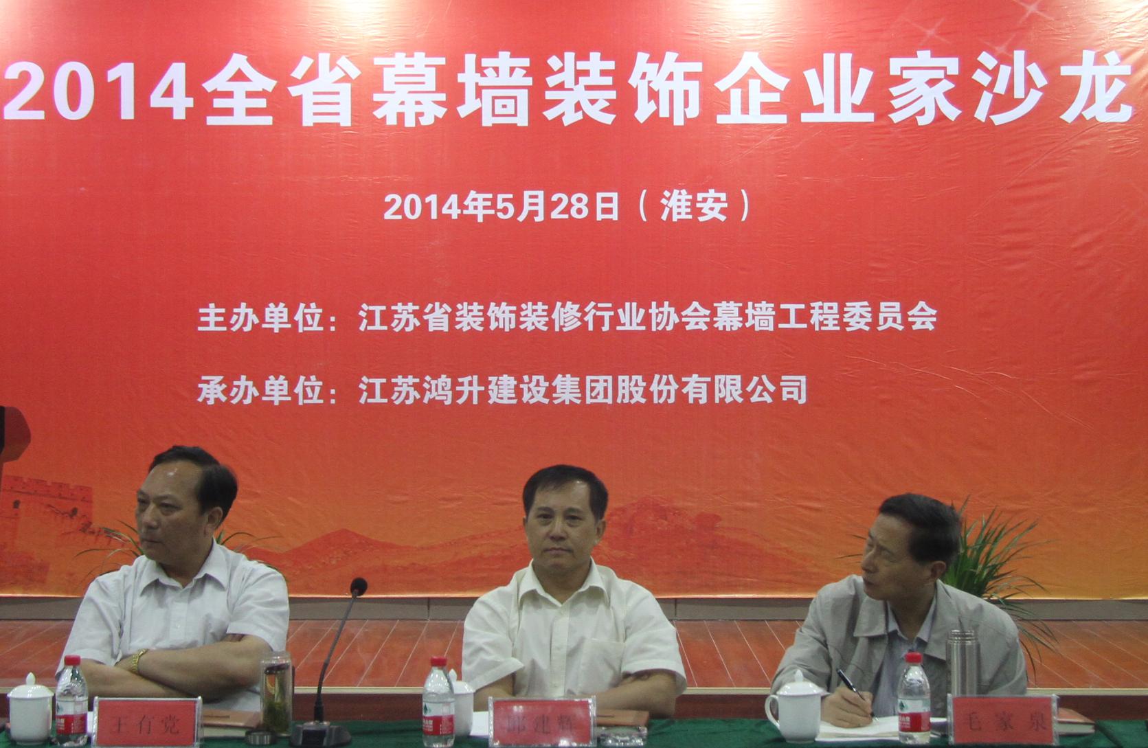 日期:2014-10-162014年5月28日,2014全省幕墙装饰企业家沙龙在我司成功召开!本届沙龙由江苏省装饰装修行业协会幕墙工程委员会主办,江苏鸿升建设集团有股有限公司承办。中国建筑装饰协会幕墙委副秘书长邱建辉、江苏省装饰装修行业协会会长王友党、江苏省装饰装修行业协会荣誉会长毛家泉、江苏省装饰装修行业协会幕墙委秘书长陶仁寿、江苏省装饰装修行业协会副秘书长沈维先等应邀出席本会。