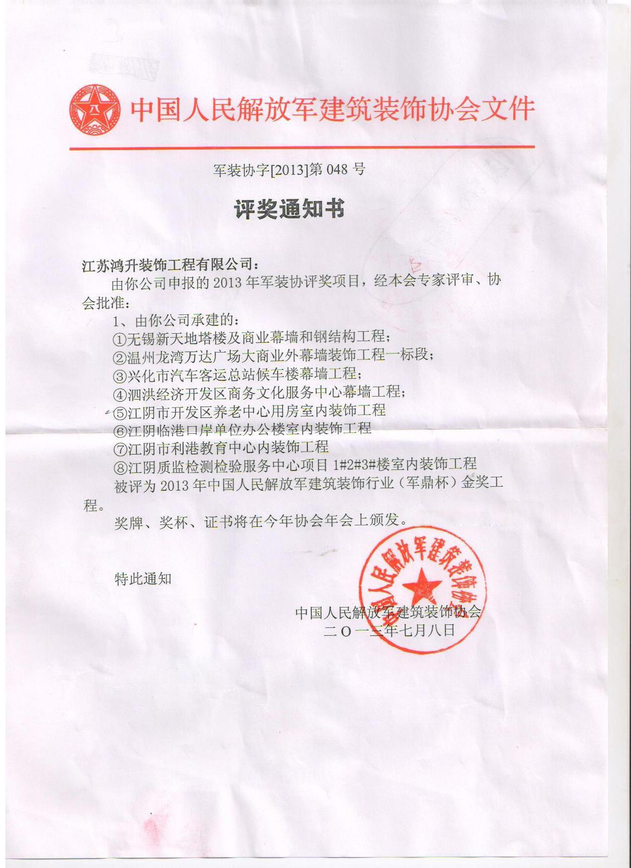 日期:2013-07-31热烈祝贺我司温州龙湾万达大商业幕墙项目、泗洪经济开发区商务文化中心幕墙项目等八个项目获得解放军军鼎杯金奖。 -