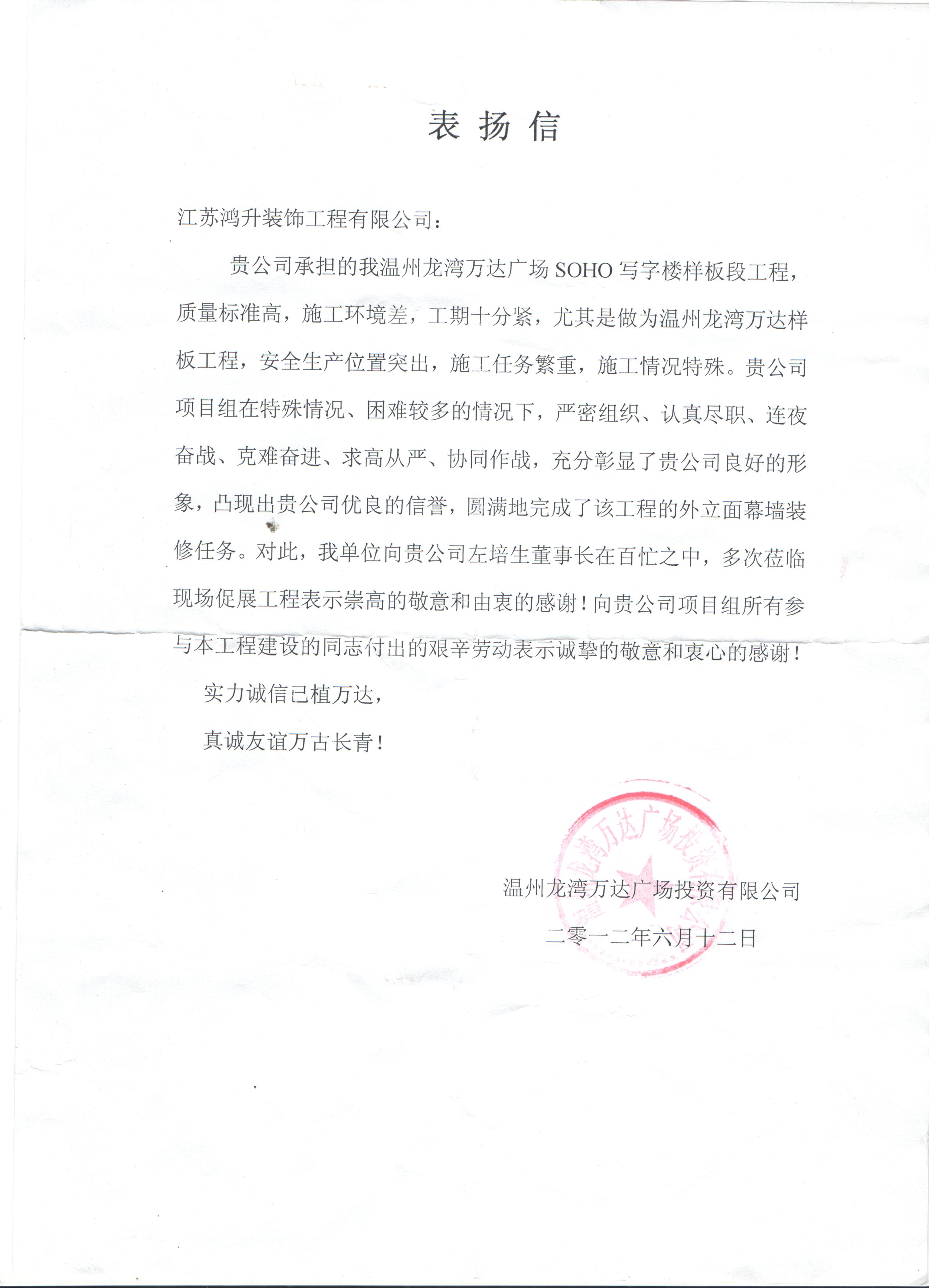 温州龙湾万达广场SOHO写字楼外装饰工程自2012年1月入场以来,在施工组织安排、施工质量控制、装饰效果把握及现场安全文明施工的落实等各方面都进行良好的把控,在现场项目经理的带领下,项目部的工作态度、工