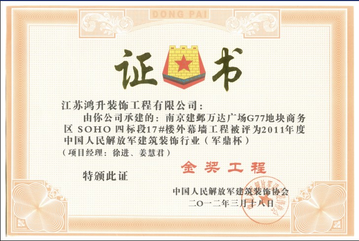 热烈祝贺我司盐城先锋国际广场商业中心幕墙工程、南京万达广场幕墙工程等四项工程,荣获中国人民解放军军鼎杯荣誉称号。