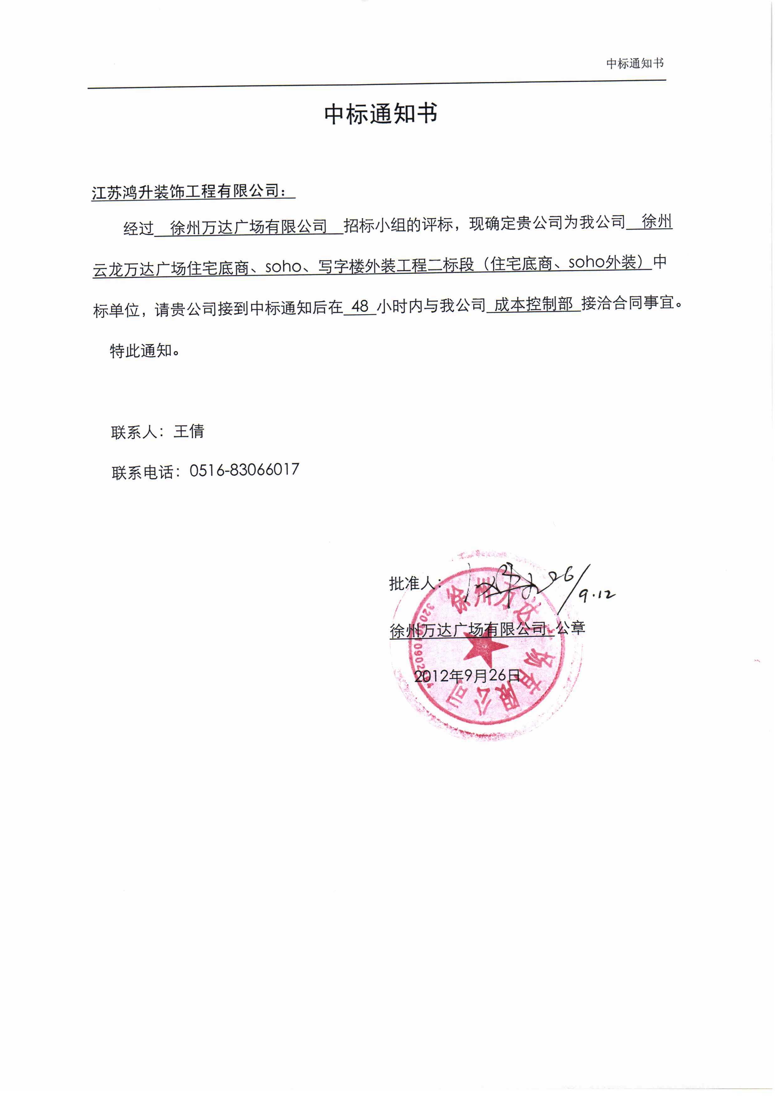 在我司全体同仁的不断努力下,我司坚持以诚信为本,以诚心为根,不断开拓外阜市场,紧跟市场潮流,继淮安、南京万达及温州龙湾万达后,我司又以1900万元中标价夺魁徐州万达广场,为企业进一步发展,奠定了坚实